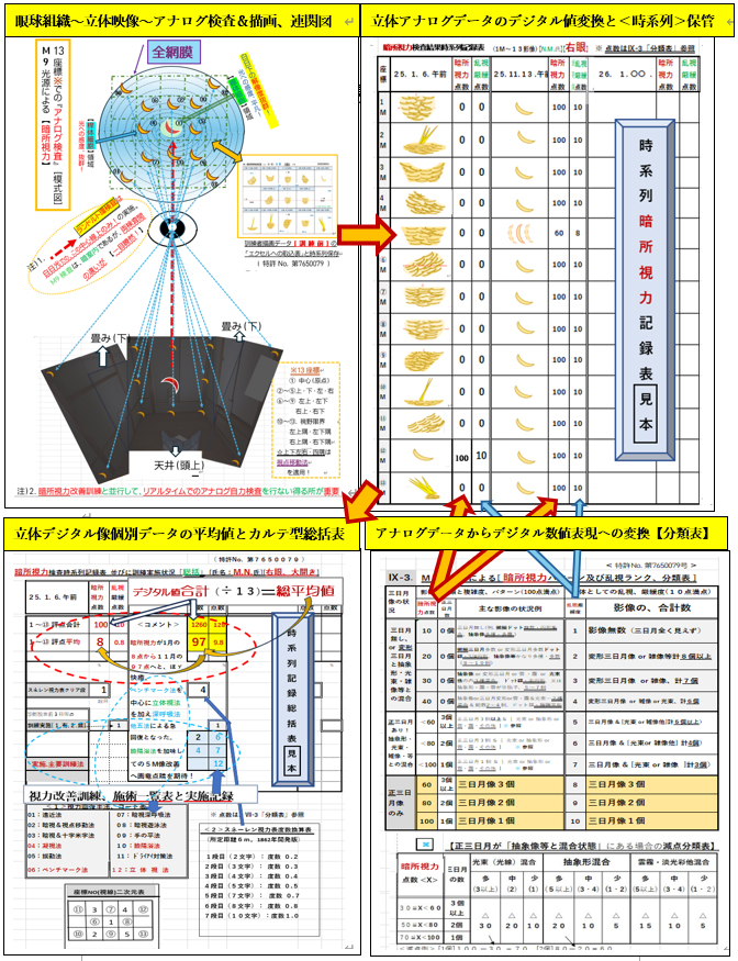 M9システムが初めてという方の為に、①「眼球組織と~立体映像~アナログ検査フロー図 ②「アナログ(=描画)視覚検査(=治験)時系列記録表③アナログ影像描画からデジタルへの変換分類表④「暗所視力立体的デジタル数値転換⑤「実施済み訓練諸法の分類番号での記録総合カルテ化…といった「AIビッグデータ解析に至る道筋」における主要な布石をフローで、俯瞰的に掲載いたしました。